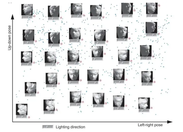这里的横轴是人脸相对于成像平面左右旋转的角度,纵轴为上下旋转的角度, 另外哈加上了光照方向信息。从这张图中我们可以清晰的看到这些因素是如何影响人脸在高维空间中分布的。