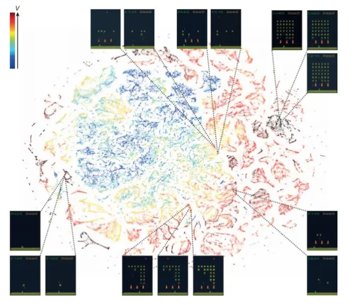 再举一个例子。Google DeepMind公司当年提出的DQN(用深度强化学习打Atari游戏)开深度强化学习之先河,为了验证CNN学习到的特征的有效性,论文里用t-SNE对各种游戏画面下CNN提取的特征进行了可视化。结果发现,需要采取相同动作的游戏画面经过CNN映射之后,其特征图像用t-SNE投影后聚集在一起,这说明CNN确实学习得到了有用的游戏画面信息。下图是他们的实验结果