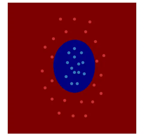 核是机器学习中一种技术,通过对原始数据进行非线性的映射,使得原本线性不可解的问题在另外一个空间中变得可能会线性可解。典型的代表是支持向量机中的核函数,它将原本线性不可分的问题变得可能会线性可分。下图是用高斯核函数的支持向量机所拟合出来的分类边界线,为曲线