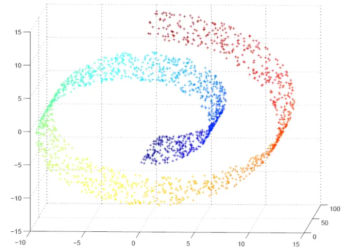 这是一个卷曲的面。我们相信很多应用问题的数据在高维空间中的分布具有某种几何形状,即位于一个低维的流形附近。同一个人的人脸图像向量在高维空间中可能是一个复杂的形状。流形学习假设原始数据在高维空间的分布位于某一更低维的流形上,基于这个假设来进行数据的分析。对于降维,要保证降维之后的数据同样满足与高维空间流形有关的几何约束关系,由此演化出各种流形降维算法。