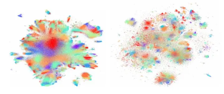 其中E为图的边的集合, 为其补集。下图是LargeVis与t-SNE的效果比较,左侧为t-SNE的降维结果,右侧为LargeVis的降维结果。