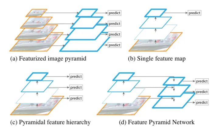 如何处理大范围尺度变化的物体是计算机视觉中的一个基本问题。图像特征金字塔[1](图1(a))是处理这个问题的一个标准解法。它在传统的基于手动设计特征的方法[2]中非常常用。一个极端的例子是DPM方法[3]使用了接近10种不同尺度来取得不错的效果。近年来,深度卷积网络的提出几乎完全替代了传统的基于手动设计特征的方法。深度神经网络本身对输入的图像具有较强的尺度鲁棒性(图1(b)),因此被广泛应用于各种物体检测系统[3][4][,5]. 然而,最近的ImageNet和COCO物体检测比赛结果表明,通过采用测试时多尺度的图像金字塔仍然可以提升最终的性能。这说明当前基于单层特征的检测系统还是具有一定的局限性。