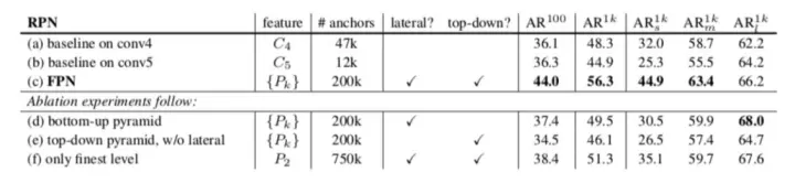 作者做了6个实验:(a) 基于conv4的RPN(原始的RPN); (b)基于conv5的RPN; (c) FPN;(d) 只用自底向上的多层特征,没有自顶向下的特征; (e) 有自顶向下的特征,但是不用横向连接,只是单纯的增加特征的分辨率; (f) 用了自顶向下的特征,也用了横向特征融合,但是只用最后的P2作为预测。对比结果见下表: