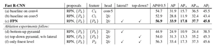 l (a)和(f)对比(31.9 v.s. 33.4):用融合度最高的特征层(P2)来做预测,在Fast RCNN中效果提升非常明显。