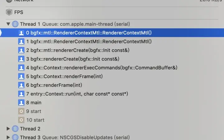 经过分析,可以知道 bgfx 的 Context 使用了命令队列,程序其它地方往队列中塞命令,而 runloop 被唤醒去执行命令。