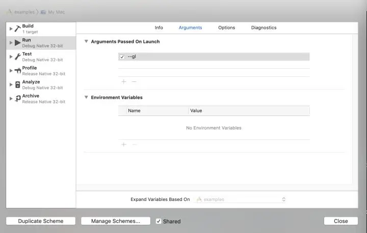 在 Xcode,配置命令行参数,启动后,可以切换到 GL。