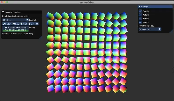 调试之后,发现是找不到资源。00-helloworld 没有用到外部资源,因而运行正常。01-cubes 用到外部资源,找不到资源就崩溃了。例子工程所需的资源在 bgfx/examples/runtime/ 下。