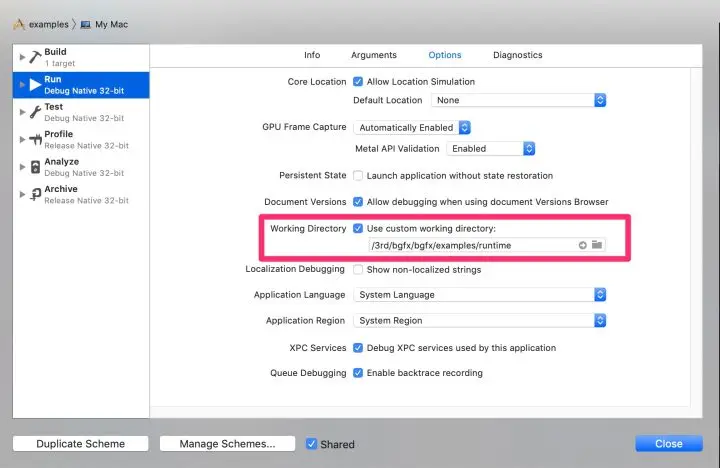 不想改源码,也可以在 Xcode 设置工作目录。目的是相同的,为了找到 runtime 中的资源。