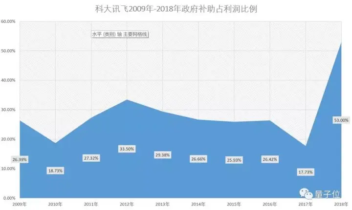 2018年年报中,讯飞获得政府补助总额2.85亿元,占比净利52.58%,意味着半数净利所得,离不开政府补助。