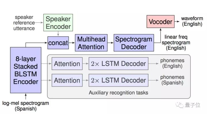 三是个可选的附加功能,原本说话人的编码器。绿色部分,经过它的加工,翻译出的英文,和原本的西语,听上去就像同一个人发出来的。