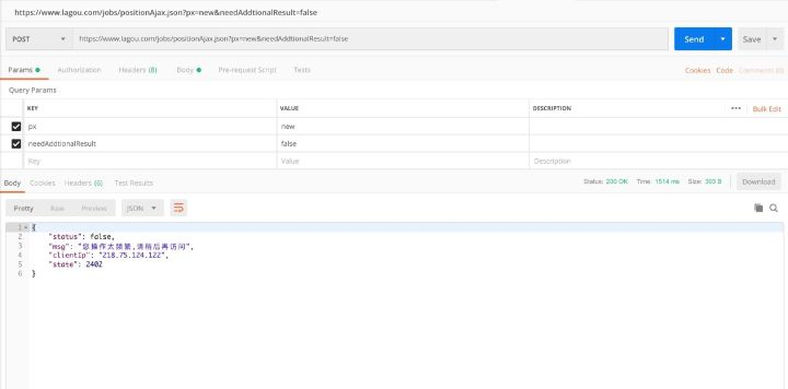 难道我们IP被BAN了,这个时候再去浏览器刷新,发现是可以打开的,ip没有被拉黑,这里的问题就是拉勾每一个职位请求都会去验证cookies。
