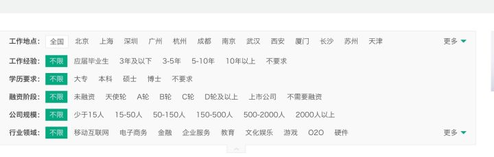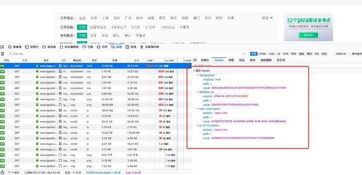 拉勾职位数据都在Ajax加载中,每一个请求都会携带上一次返回的cookies。我们来做个试验,先在浏览器中打开该网址:https://www.lagou.com/jobs/list_?px=new&city=%E5%85%A8%E5%9B%BD,搜索全国职位数据,所有职位数据都在这里: