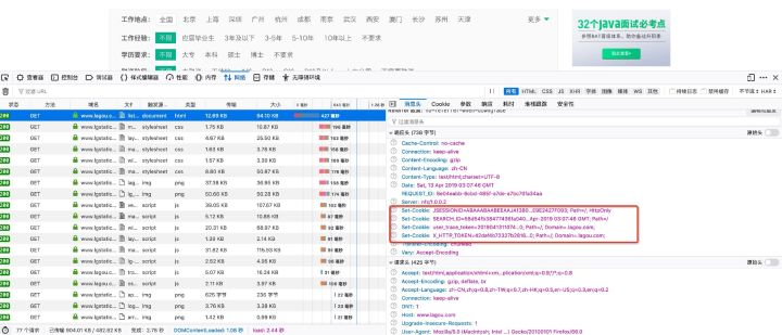 会显示完整请求头,对比Chrome,差别就出来了。现在的问题是这几个cookies是本地生成的还是服务端返回的。仔细寻找发现是第一条请求发送之后,对方服务器返回的,如图