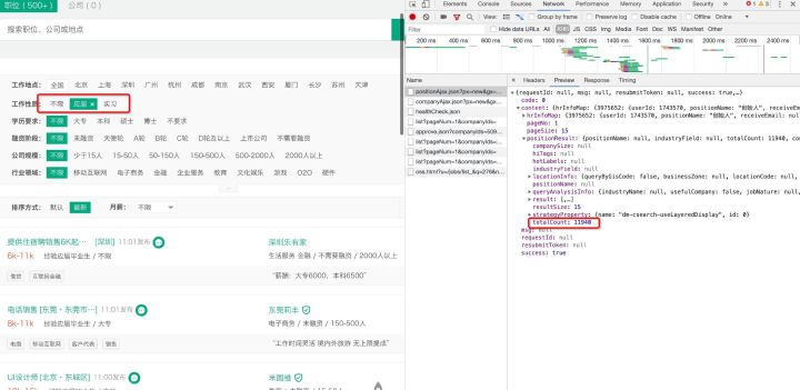 可以看到还有有职位总数totalCount字段,但是该字段真实性需要考证。