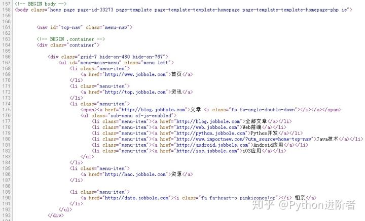 一般的,像类似于<head>这种结构,称之为一个节点。如上图,根据层次关系,我们可以知道<body>节点是<nav>的父节点,相应的,<nav>节点是<body>节点的子节点。同胞节点又叫兄弟节点,一般的处于同级层次的节点叫同胞节点,如上图中的<nav>节点和第一个<div>节点、177~181行的<li>标签都是属于同胞节点。先辈节点又叫祖先节点,一般的,一个节点的上层以上的节点均称为先辈节点,所以父节点也是属于先辈节点的一种。基于此,我们又可以称<body>节点是<nav>的先辈节点。相对应的,一个节点的下层以下的节点均称为后代节点,所以子节点也是属于后代节点的一种。基于此,我们又可以称<nav>节点是<body>节点的后代节点。