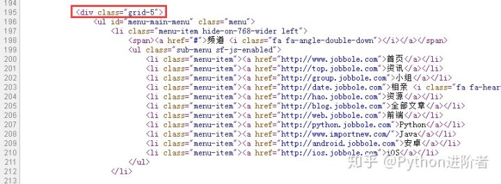 如上图中的红色框框中,class为属性,而等于号后边的“grid-5”即为属性值,有的时候节点内不只是一个属性,如上图中的196行中,就有两个属性。