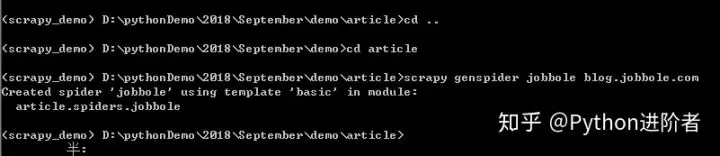 在我们创建好Scrapy爬虫项目之后,会得到上图中的提示,大意是让我们直接根据模板进行创建Scrapy项目。根据提示,我们首先运行“cd article”命令,意思是打开或者进入到article文件夹下,尔后执行命令“scrapy genspider jobbole blog.jobbole.com”,代表通过Scrapy中自带的basic模板进行创建Scrapy项目,如下图所示。