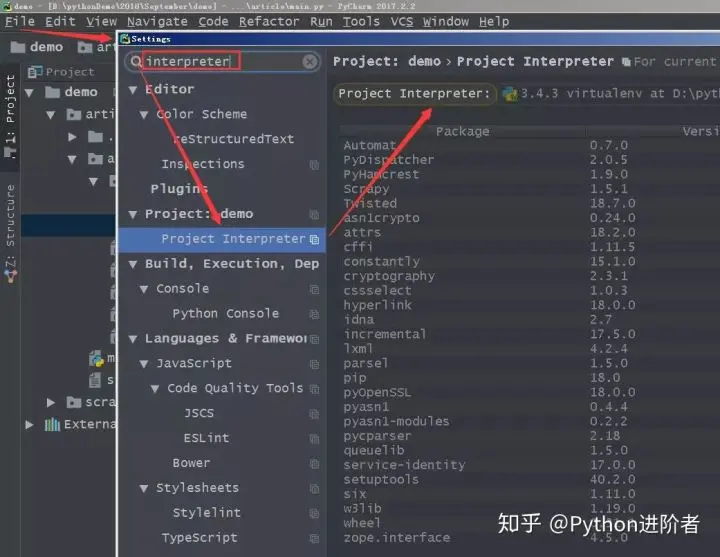 接下来最后检查一下该项目的Python解释器,点击Pycharm的setting,然后输入“interpreter”,找到解释器所在的位置,如下图所示。