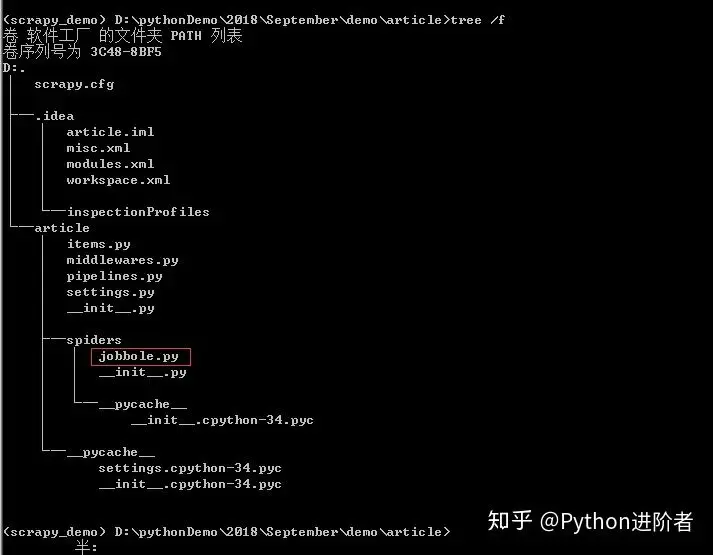 根据提示,该模板创建的位置为article.spiders.jobbole,此时再次输入tree /f命令可以查看到除了之前创建Scrapy爬虫项目的基础文件之外,在spiders文件夹下确实是多了一个jobbole.py文件,如下图所示。