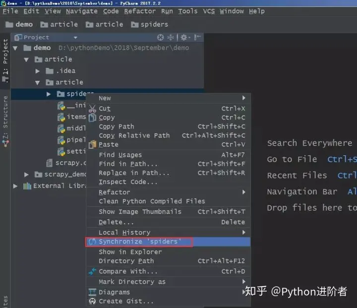 如果在Pycharm中的spiders文件夹下看不到jobbole.py这个文件的话,则先选中spiders文件夹,尔后右键,点击“Synchronize spider”,代表与spiders文件夹进行同步的意思,尔后便可以看到jobbole.py就会被加载出来。