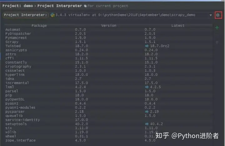 如果“Project Interpreter”显示出来的解释器不是当前项目下的虚拟环境,则点击“Project Interpreter”的右侧的设置按钮,如下图所示。