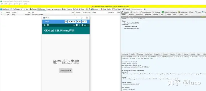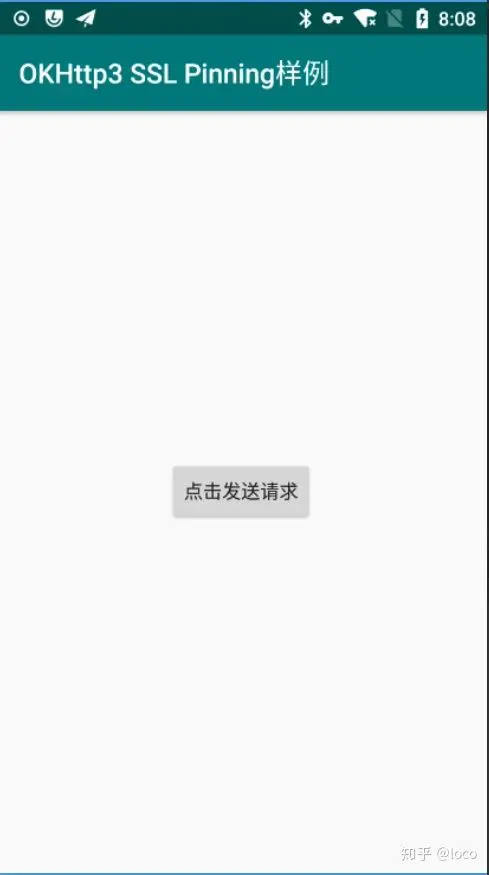 这里我专门写了一个样例APP来进行演示(别抓我,我什么都不知道),这个APP做的事情就是在你点击了按钮之后,对百度首页发起一次请求,但是这个请求在没有破解SSL Pinning的正常情况下是不可能成功的,因为我设置的是一个随便输入的证书哈希,所以在请求的时候会因为正常的证书哈希与我随便输入的哈希不同导致出现请求失败的情况。