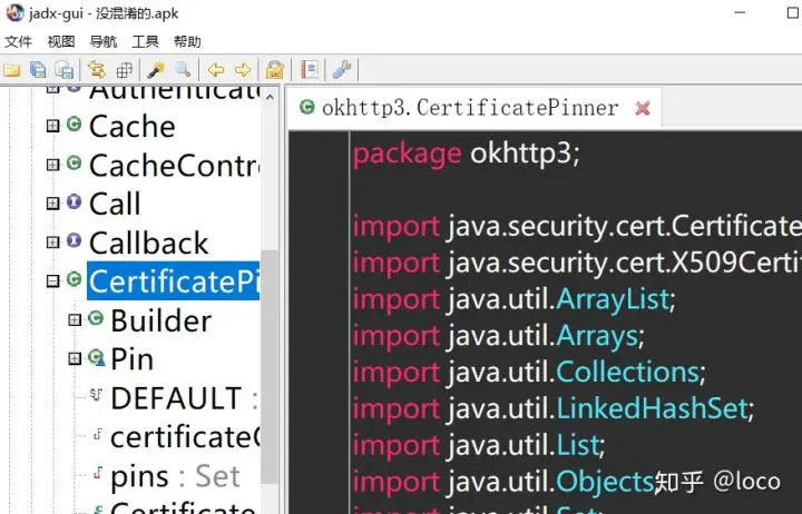 可以看到它的代码中是对okhttp3.CertificatePinner类下的check方法进行Hook的,这个CertificatePinner类和check方法在没混淆过的APK中可以很清楚地看到。