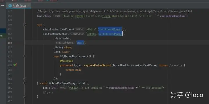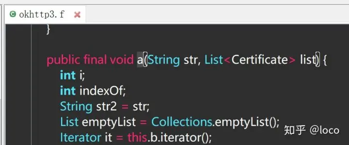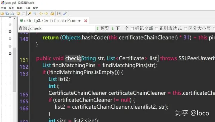 那么现在JustTrustMe面对混淆后的版本就失效的原因已经很清晰了,因为它找不到这个okhttp3.CertificatePinner.check,所以根本就不可能Hook到检测方法,自然不会有任何效果。