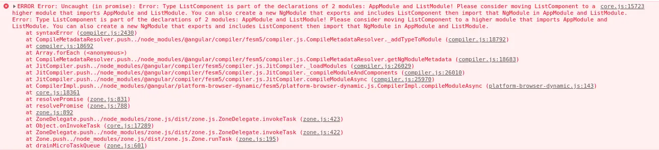 将ListComponent注册到NgModule中,在模板内就可以使用<app-list><app-list>,在这里要注意一下,当我们使用ng g c list --module app创建component时会会帮我们在app.module.ts中声明一次,我们需要将它删除掉,不然会报错.