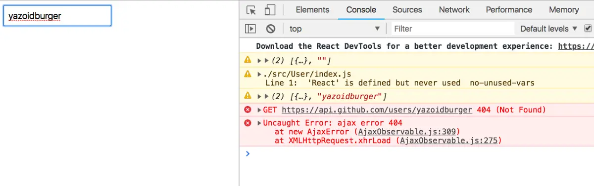 将我们的 input 流切换为 ajax 请求流。一旦请求完成,response 就会被提取出来,并 map 到我们的 User 组件中去。