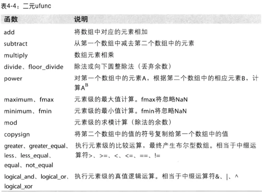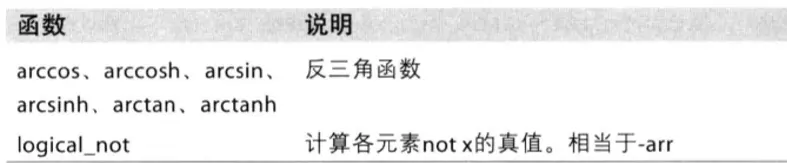 - 三元表达式x if condition else y可用numpy.where(condition,x,y)代替,表示condition为一个布尔数组,在True的位置用x对应位置填充,在False的位置用y对应位置填充,其中x,y可为数组或者标量,若为数组,shape必须与condition相同