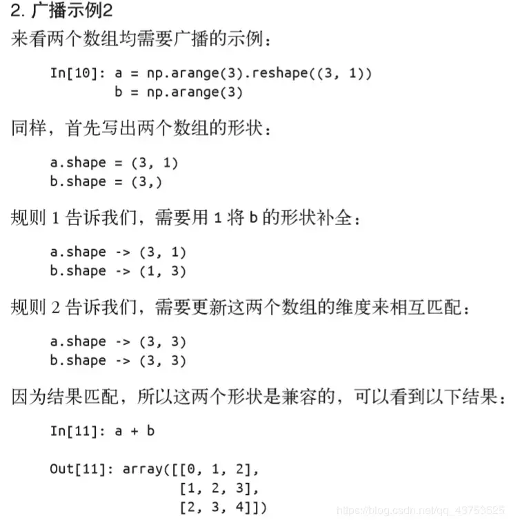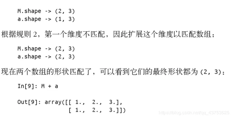 规则 2: 如果两个数组的形状在任何一个维度上都不匹配,那么数组的形状会沿着维度 为 1 的维度扩展以匹配另外一个数组的形状。