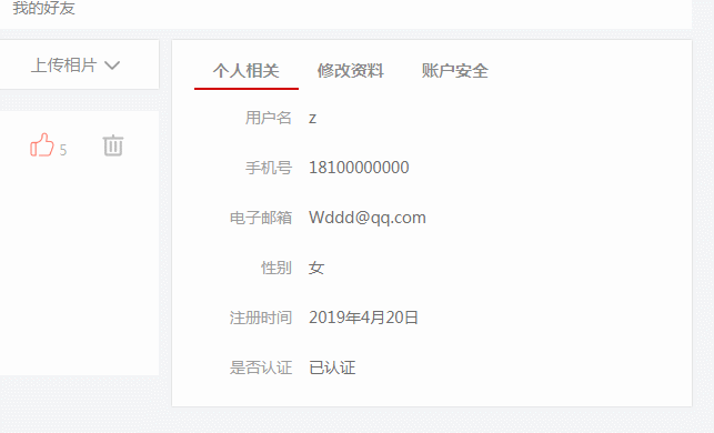 一天完成一点,进度太慢了啊 rotd 2019-04-20 263 阅读1分钟 完成了用户信息的修改更新,头像上传等等,在这里记录一下,自己搭的ui有点好看吧,哈哈 然后动态生成DOM节点标签,用JQuery的话,你们都是这样拼接字符串的么,,感觉好冗余啊,想用VUE,但是还没时间学,唉