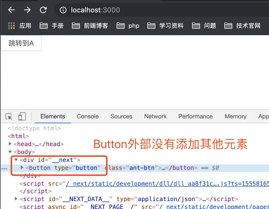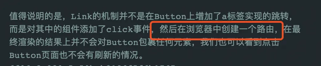 值得说明的是,Link的机制并不是在Button上增加了a标签实现的跳转,而是对其中的组件添加了click事件,然后在浏览器中创建一个路由,在最终渲染的结果上并不会对Button包裹任何元素,我们也可以看到点击Button页面也不会有刷新的情况。