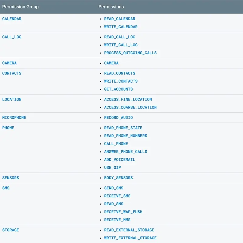 有关权限组更多的介绍请至官方的权限说明文档,以下是从文档中截取的关于权限分组的表格: