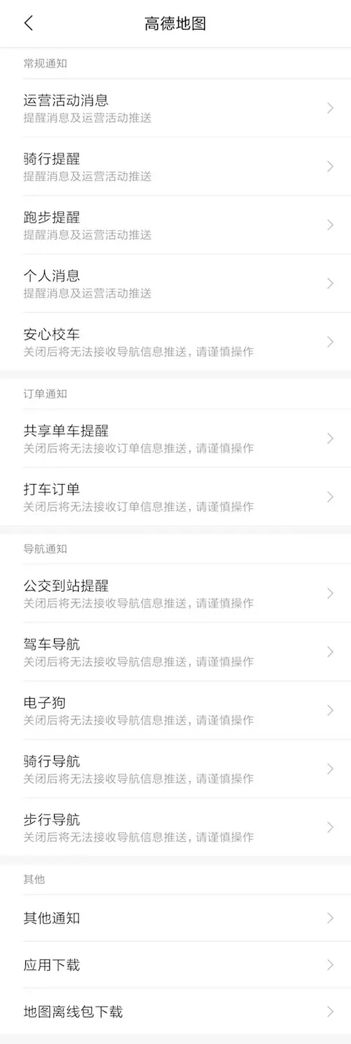 以高德地图为例(MIUI系统),其消息通知共分为了 4 个渠道组,其中每个渠道组下又有不同的渠道类别: