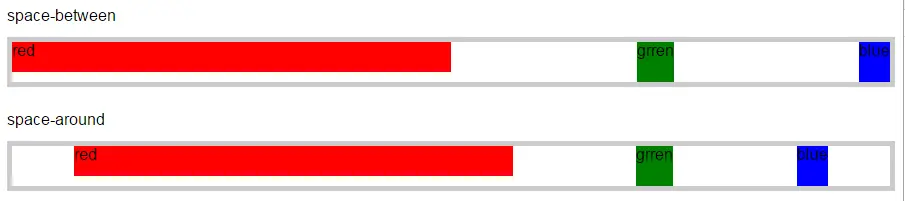 - space-around 两边对齐,但跟 space-between 不同的是,它在两侧各有 1/2 的间距(不常用)