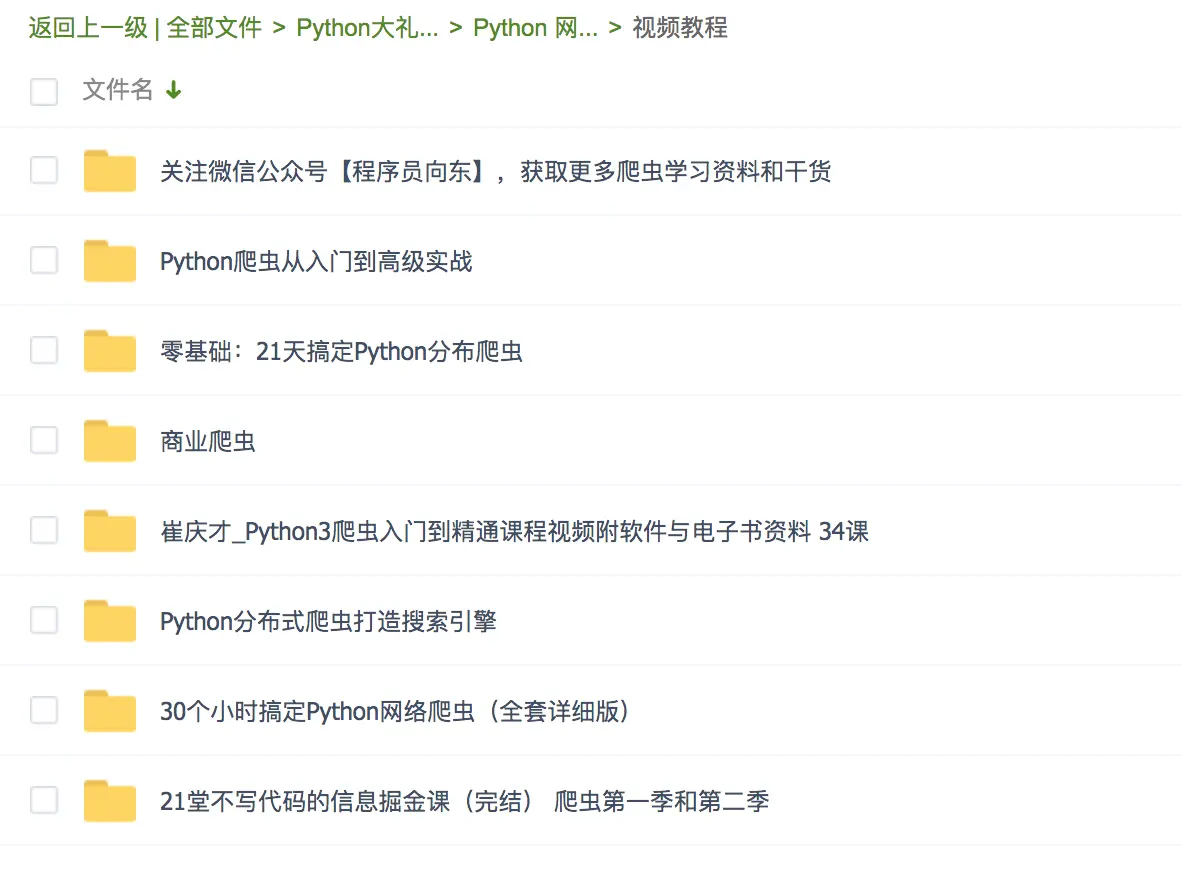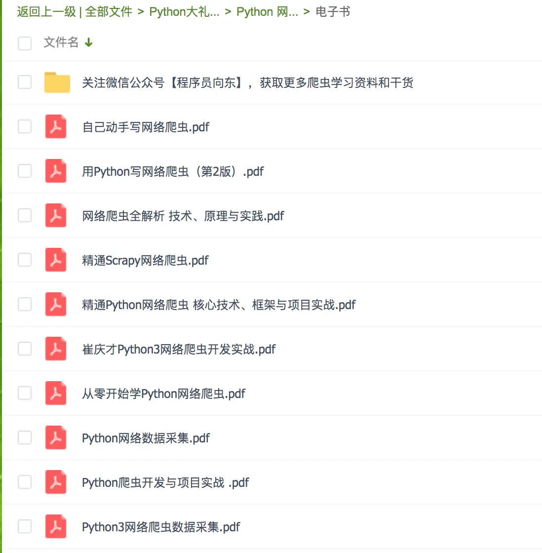 接下来我会分上面两种情况给大家列出我搜集的各种爬虫电子书和视频教程,如果你想要的话,可以关注我公众号:程序员向东,然后回复关键字:爬虫,即可获取一个打包的百度网盘地址。真诚送,无套路。
