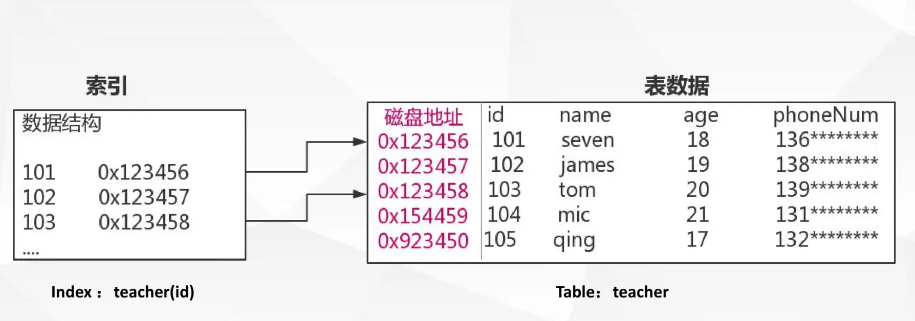 索引是为了加速对表中数据行的检索而创建的一种分散存储的数据结构 解释:索引和数据都是存在磁盘的,需要把数据拿到内存中进行比较查找到对应的数据,如果没有用索引,就会从磁盘全盘扫描,如果走索引,他会通过索引找到对应的数据位置,从而直接去取数据