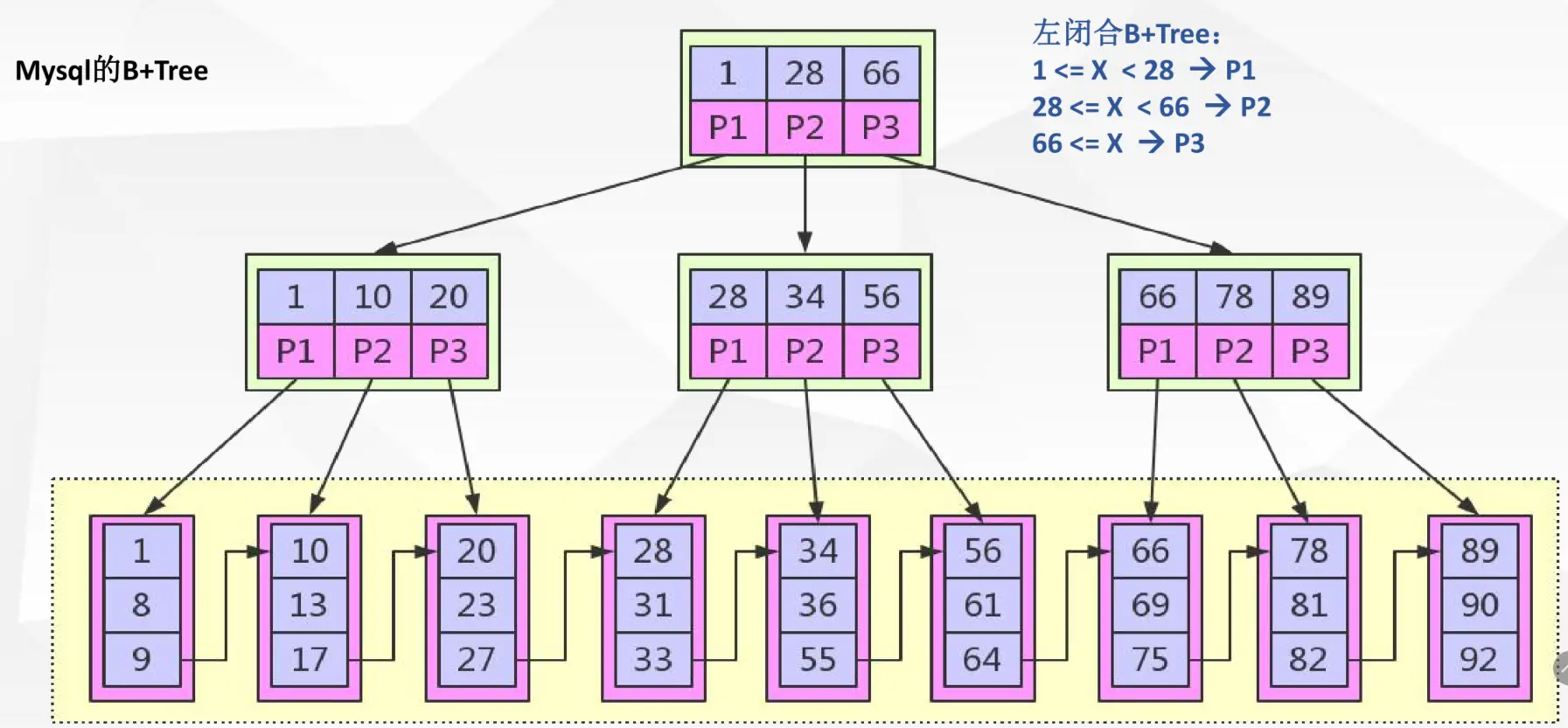 - B+叶子节点是顺序排列的,并且相邻节点具有顺序引用的关系