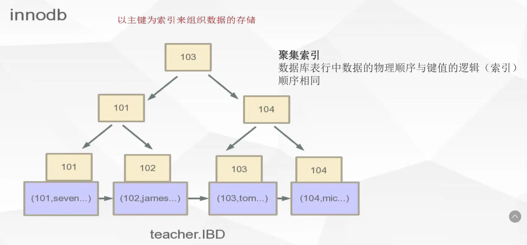 InnoDB都会以主键为索引来组织数据的存储,如果没有指定主键,它会定义一个隐藏的默认的主键索引