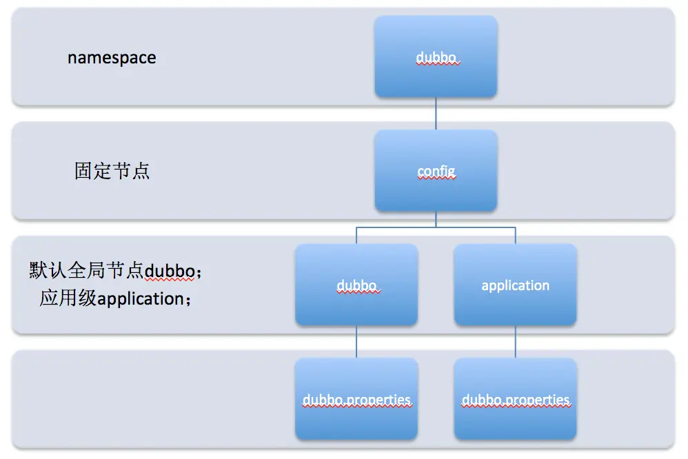默认所有的配置都存储在/dubbo/config节点,具体节点结构图如下: