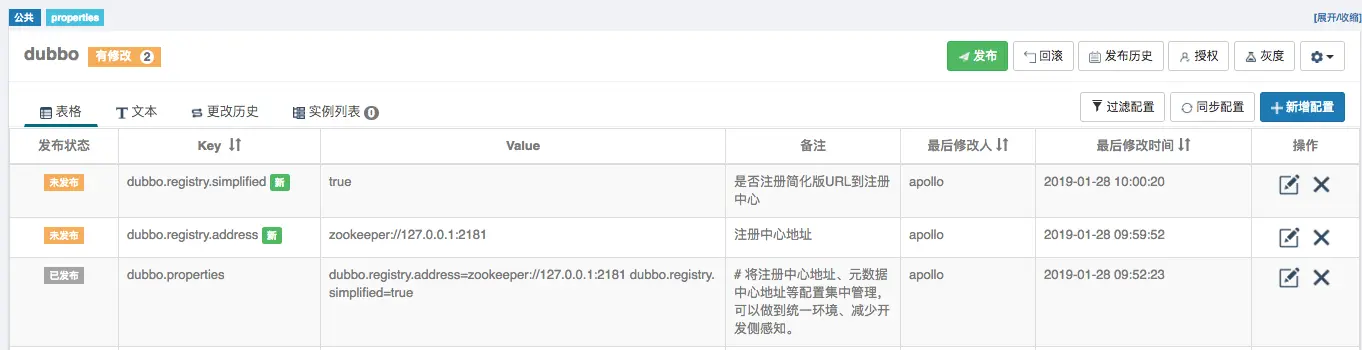 - 注意:当前dubbo.properties是作为一个key存储在Apollo namespace中,为更好的适应Apollo的设计理念,在接下来的版本中可能会调整为