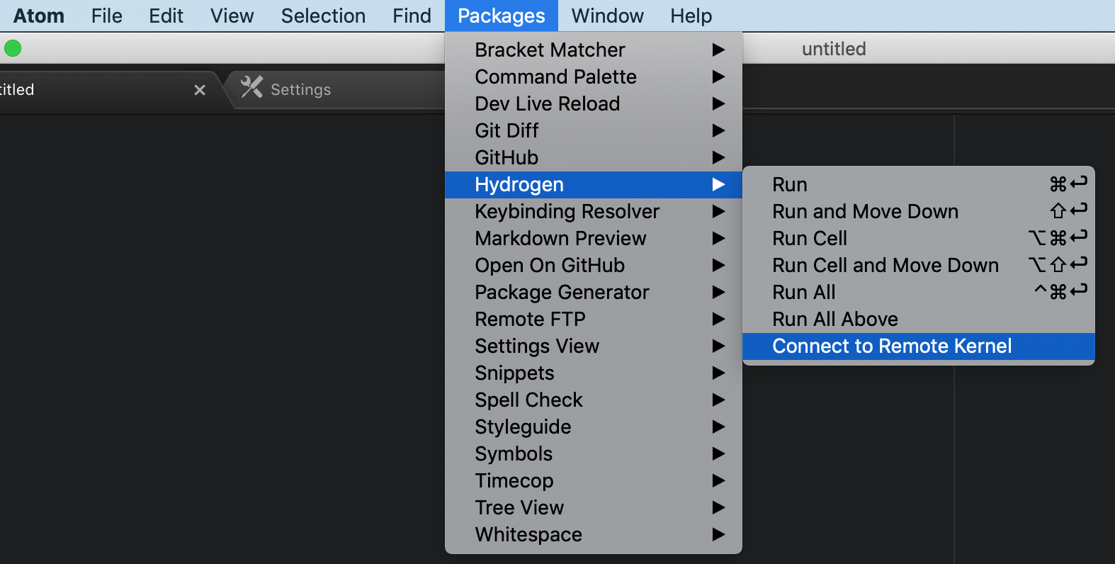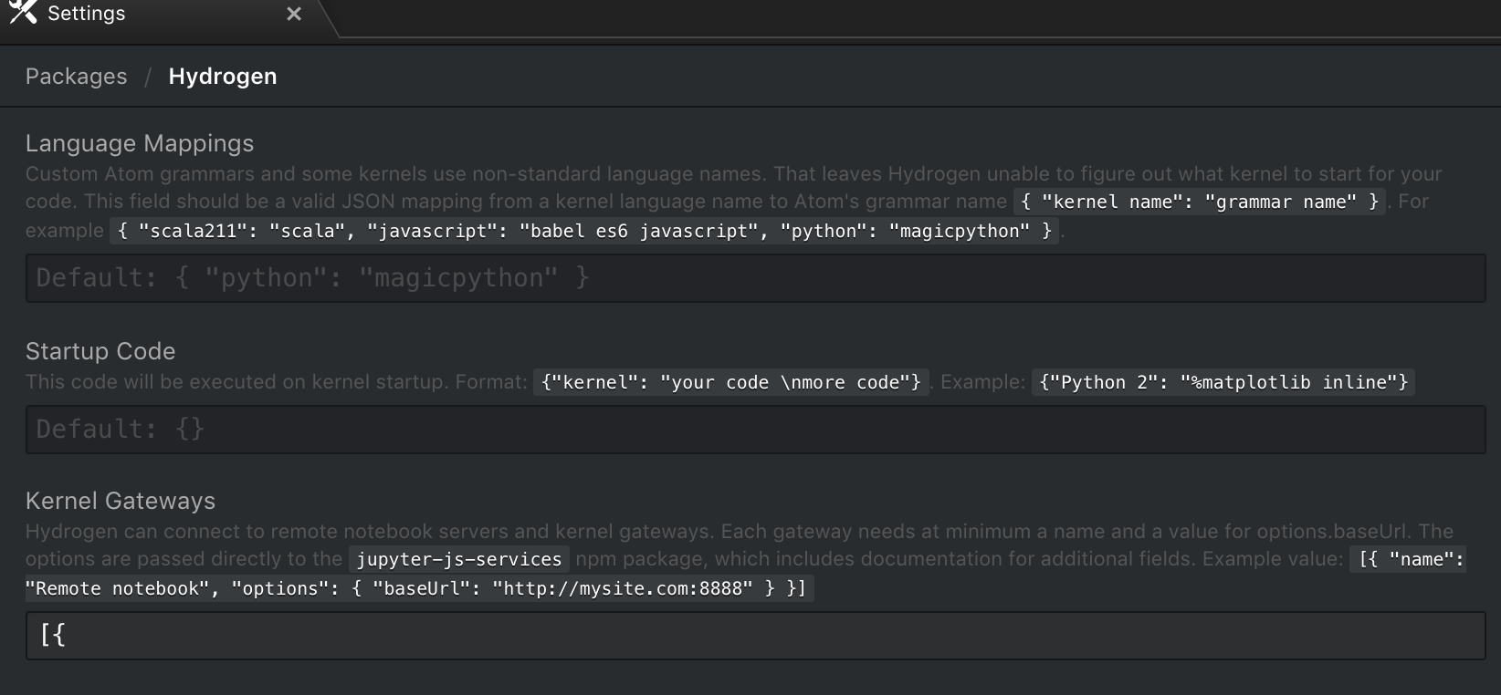 第三,我们需要安装hydrogen包。安装完成后,我们需要按照此指令配置远程内核函数。也就是说我们需要从Jupyterlab配置中复制一些信息并将它们放入hydrogen的网关设置中,如下所示: