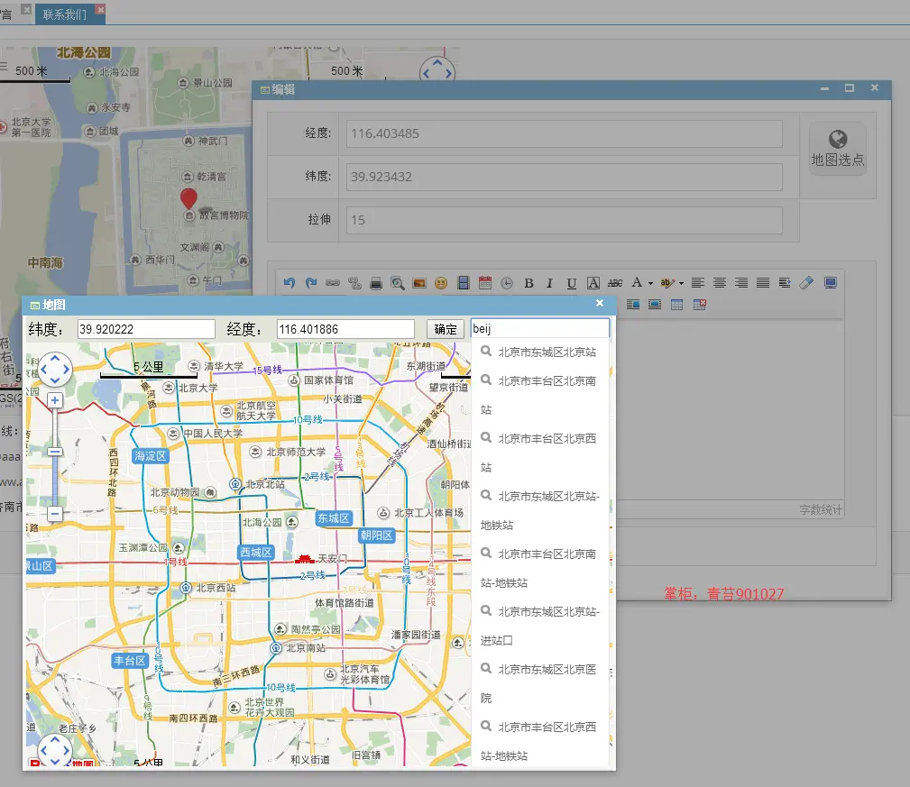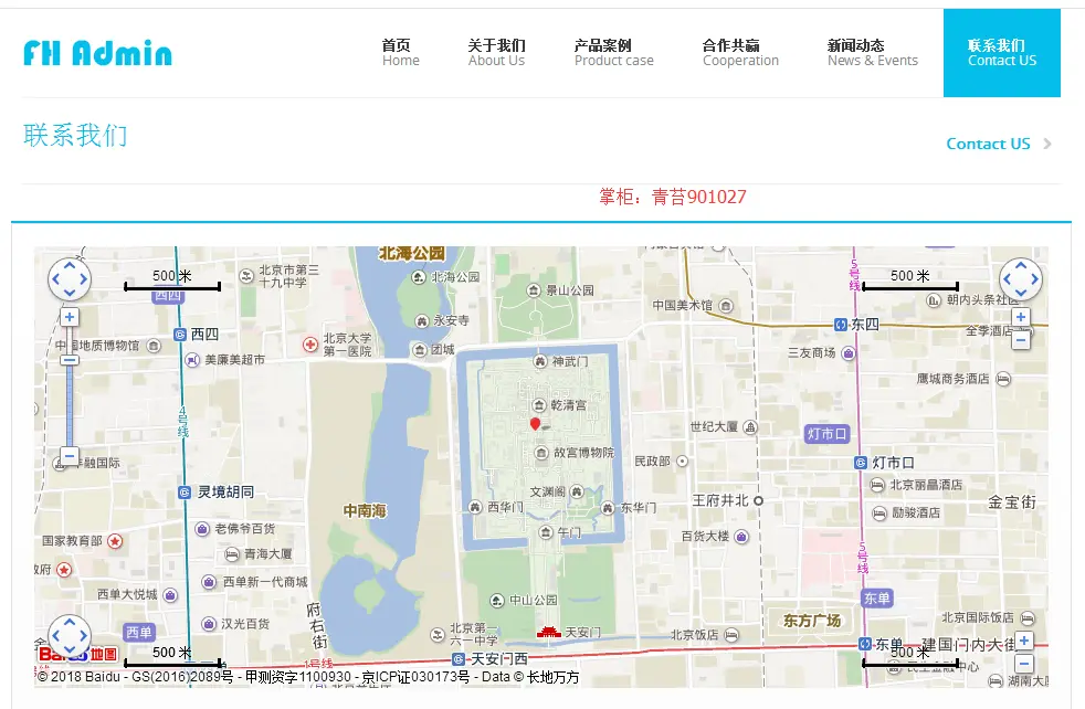 . 联系我们:维护联系我们栏目数据 地图选点获取经纬度,地图位置描点用于指示公司位置