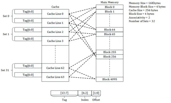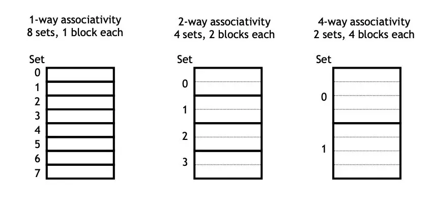 Set Associative Cache是Direct mapped cache 和 Fully associative cache的一种取舍。cache 被分成了多个 set,每个 set 里面有多个 cache line。一个 memory block 会先被 map 到其中一个 set,然后置于此 set 中的任一cache line。