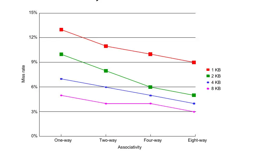 那么现实生活中,该采用 ?-way Associative Cache呢?一般选择8-way 就足够了,下图的数据可以得到一个直观地感觉。