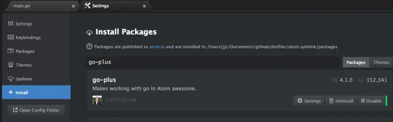 1.安装go-plus插件,这个插件提供了Atom中几乎所有go语言开发的支持,包括 tools, build flows, linters, vet 和 coverage tools。它还包含很多代码片段和一些其它特性。