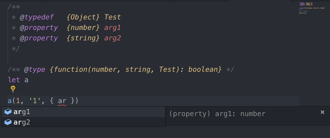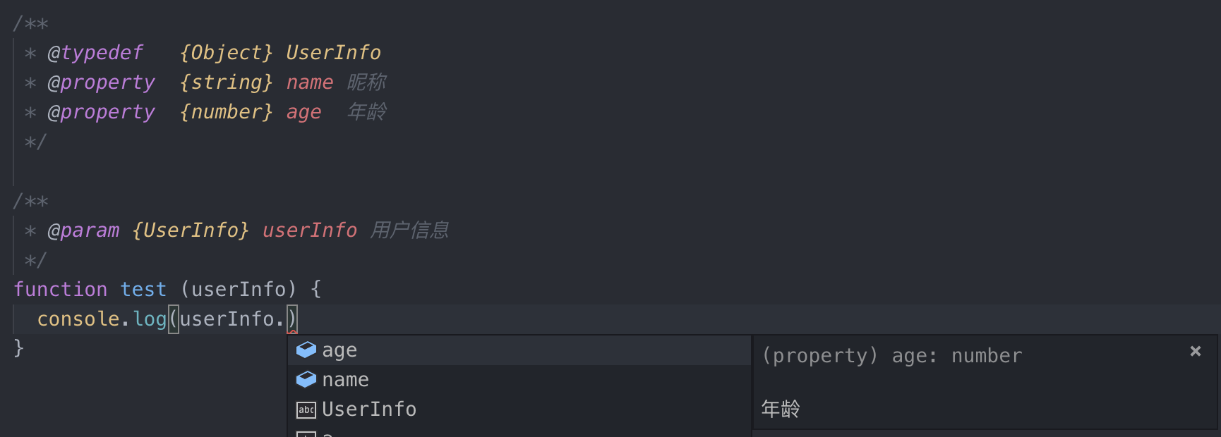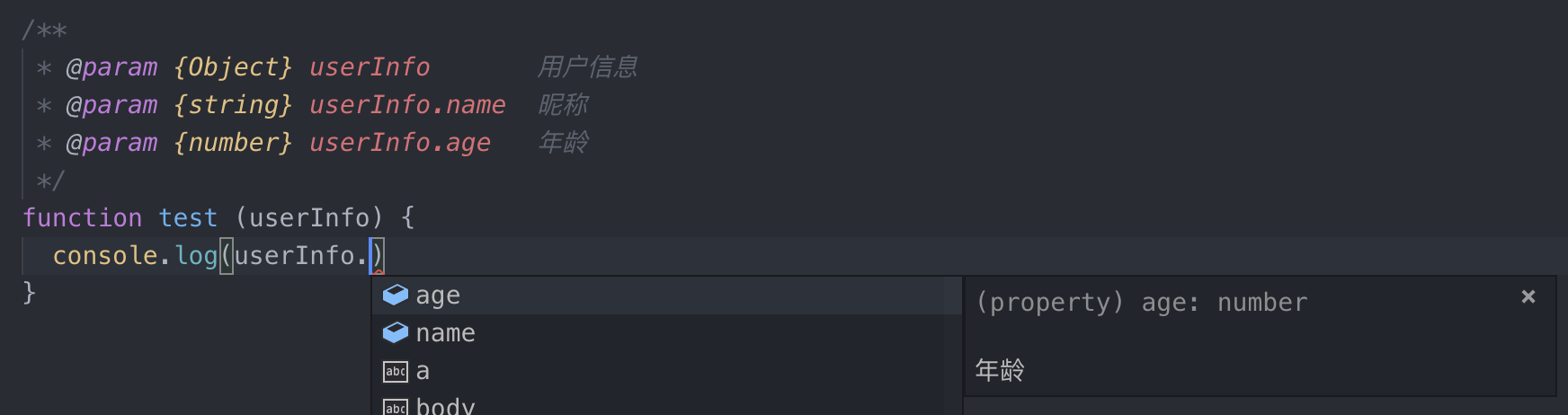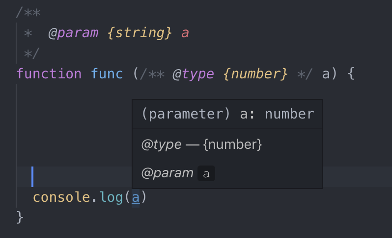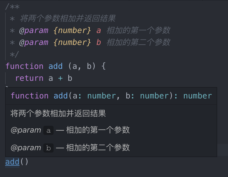 再回到我们最初的那个代码片段上,将其修改为添加了 JSDoc 版本的样子: