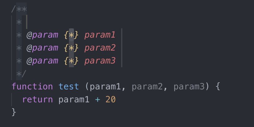 而多行的写法是比较常用的,在 vscode 中可以直接在函数上方键入 /** 然后回车,编辑器会自动填充很多的内容,包括参数类型、参数描述以及函数描述的预留位置,使用TAB键即可快速切换。